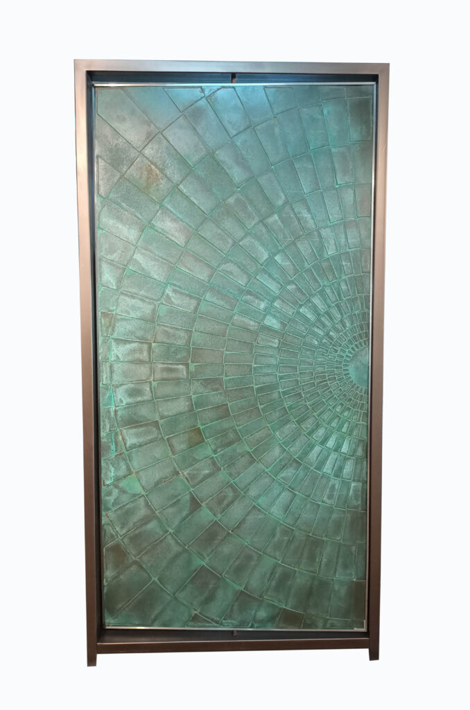 Note: This particular finish is for illustrative purpose only and can be achieved in Brass, Bronze, Copper and Metallure finishes on any solid surface like (Metal,Wood,MDF) doors in any practical size.